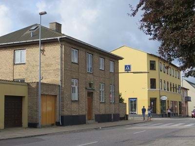 Langs Jernbanegade ligger huse i 2½ etage med butikker i stuen.