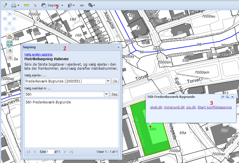 Klik her for at komme ind i den samlede kortløsning, søg en adresse eller matrikel under "Søgning" (1-2). Klik derefter på linket "Start konfliktsøgning" (3):