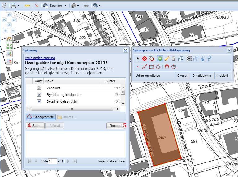 Denne funktion bruges til at søge oplysninger ved hjælp af f.eks. en adresse eller matrikel i kortet. Der kan foretages en søgning i alle de kortlag, som er en del af kommuneplanen. Som standard er kun tilvalgt temaer, der har indflydelse på, hvad man kan bruge arealerne til. Det kan f.eks. være zonekortet, kommuneplanrammerne, naturbeskyttelsesområder, m.m. Punktudpegninger som for eksempel skoler, daginstitutioner, campingpladser, m.m. er ikke som standard en del af denne søgning, men kan tilvælges, hvis man ønsker det.